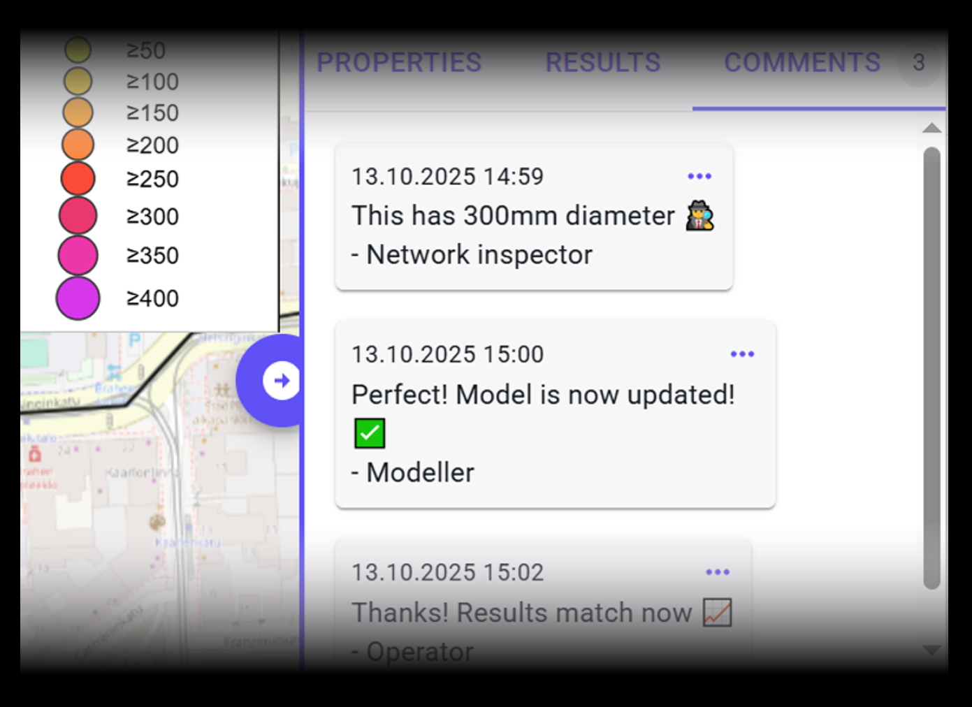 Fluidit Vision makes collaboration between utilities and consultants transparent and straightforward. In most cases, consultants prepare and update hydraulic models and then share them directly with the utility through Vision, ensuring that the utility always sees the latest, correct versions. This eliminates the need for file transfers, avoids misaligned versions, and supports clear, structured communication directly inside the platform.